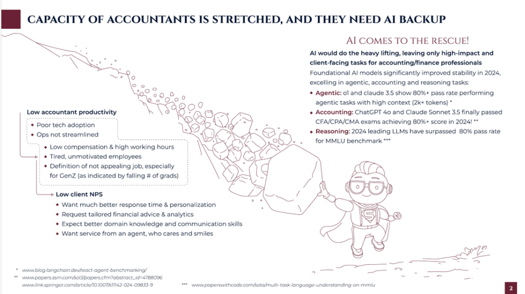 People struggle to remember the custom chart of accounts of several dozen clients, or handle accounting for multiple complex industries like logistics or manufacturing. And don’t forget about the ever-changing regulatory landscape! - Besides making judgments, accounting is also very communicative. An accountant needs to request a lot of information (explaining why he needs it), clearly guide the client throughout the process with multiple deadline cadences (monthly/annually), educate him on the meaning of the numbers provided, and promptly reply to accounting- and tax-related client queries. AI can significantly speed up this process by confidently handling conversations while considering the client’s communication preferences.