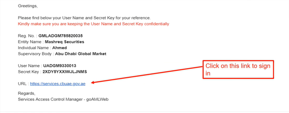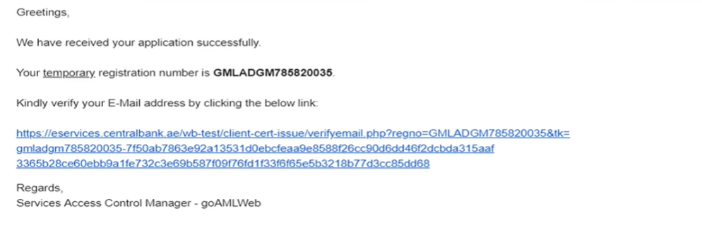 Once you click the ‘Submit’ button, you will receive a temporary registration number via the email ID you submitted. The same email will also contain a link to verify your email ID. If you do not verify your email ID, you cannot proceed with the registration. Check your spam or junk folders if you cannot find the email verification link. If you still cannot find the email, try whitelisting ‘webmaster@eservices.centralbank.ae’ and then, send a request to resend the verification email to ‘goaml@cbuae.gov.ae’.