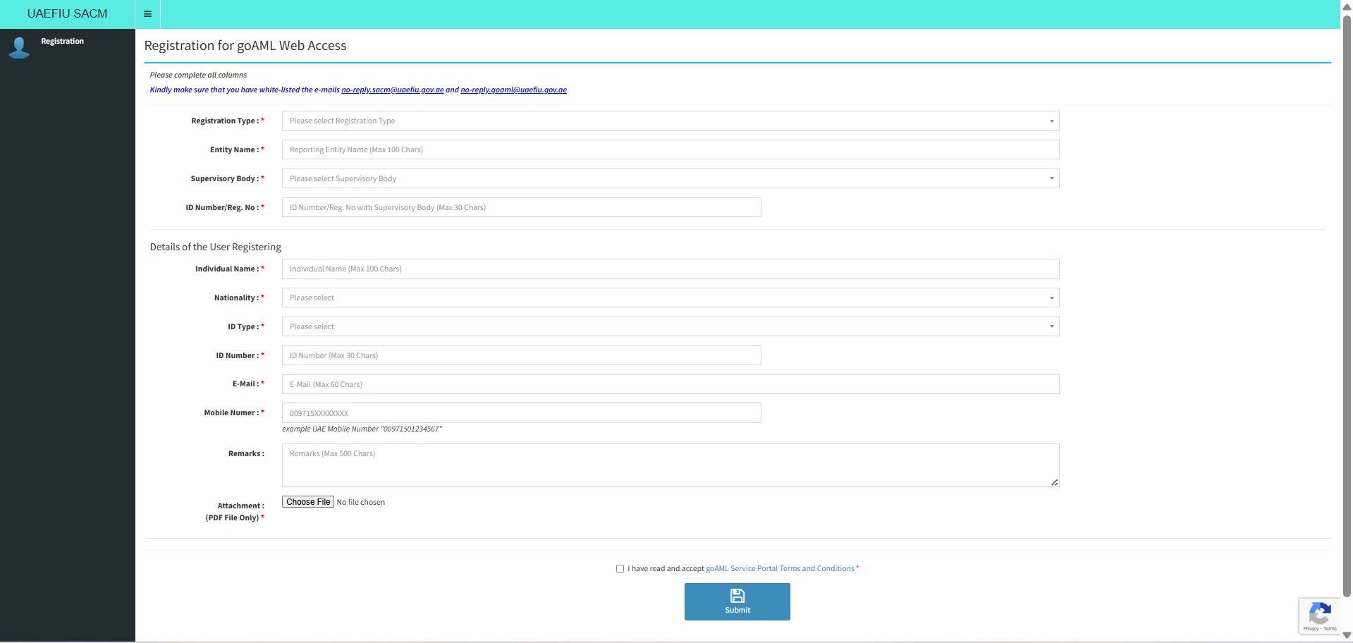 Once you click on the registration button, you can start filling out the following form. You must provide details, such as the entity ID number and user details. Please ensure that the submitted email ID and mobile number are operational and can receive email and SMS OTPs and notifications. Do not forget to attach the earlier-mentioned documents. Before clicking submit, select the checkbox confirming that you have read and accepted the goAML portal terms and conditions.