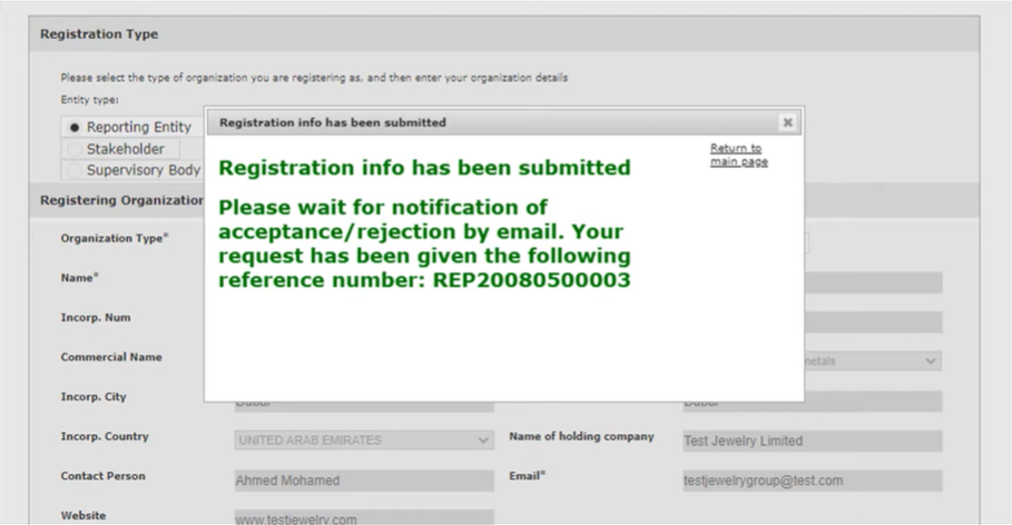 Once the registration request is submitted, a ‘Registration Submitted’ confirmation screen will appear. This screen will display a registration reference number. This reference number is important and must be retained for any registration-related inquiries with the supervisory body.