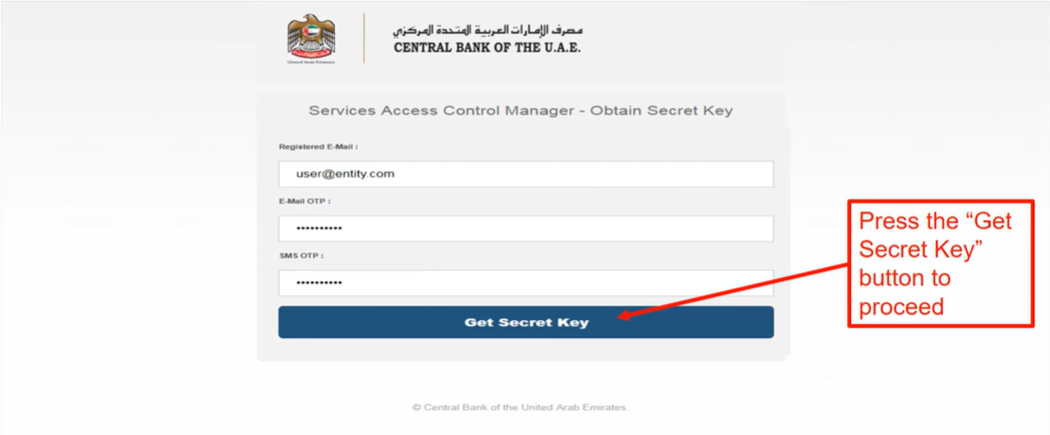 Click on the link shared in the email. Then, in the window that opens upon clicking the link, enter your registered email ID, SMS OTP and email OTP and click on ‘Get Secret Key’.